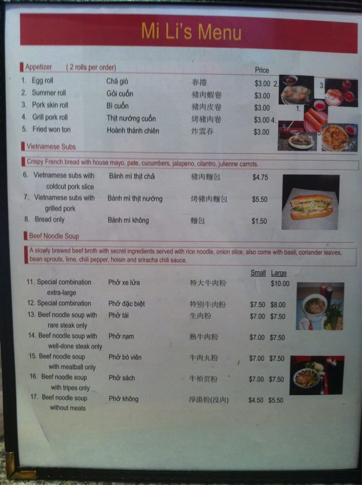 Mi Li Cafe, a Vietnamese restaurant located in Columbus, OH, offers a variety of delicious dishes with many vegetarian options available. The menu includes appetizers like Bi Cuon (Pork Skin Roll) and Goi Cuon (Summer Roll), seafood soups such as Hu Tieu Do Bien and Mi Do Bien, as well as beef noodle soups like Pho Tai Nam and Pho Tom. Customers rave about the authentic flavors and fast service at Mi Li Cafe. Reviewers praise the pho and summer rolls, highlighting the excellent customer service and reasonable prices. The cozy atmosphere and quick service make it a top choice for a satisfying meal. With options for delivery, takeout, and catering, Mi Li Cafe provides a convenient and delicious dining experience for all.